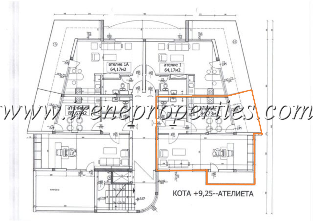 Разпределение: Голямо отворено пространство (прегражда се по желание на клиента) с 2 тераси (на Изток и Юг). По план бокс, 3 работни помещения, Б+WC. ИзложениеЮгоизток